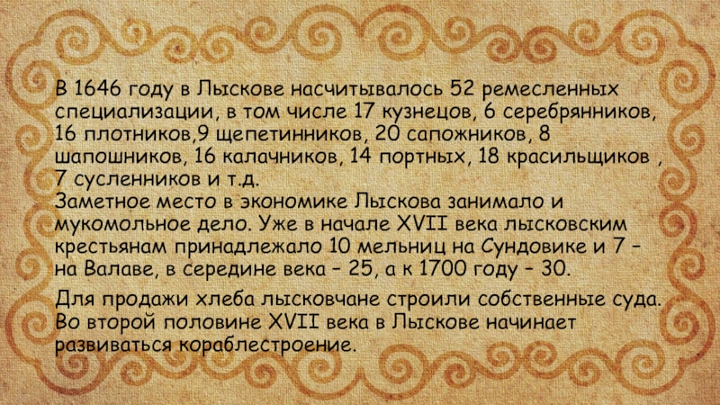 Слайд 21В 1646 году в Лыскове насчитывалось 52 ремесленных специализации, в том