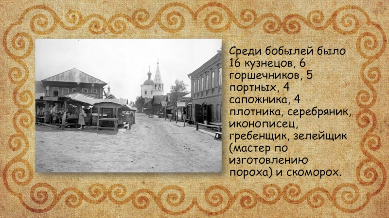 Слайд 19Среди бобылей было 16 кузнецов, 6 горшечников, 5 портных, 4 сапожника,