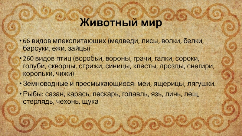 66 видов млекопитающих (медведи, лисы, волки, белки, барсуки, ежи, зайцы)