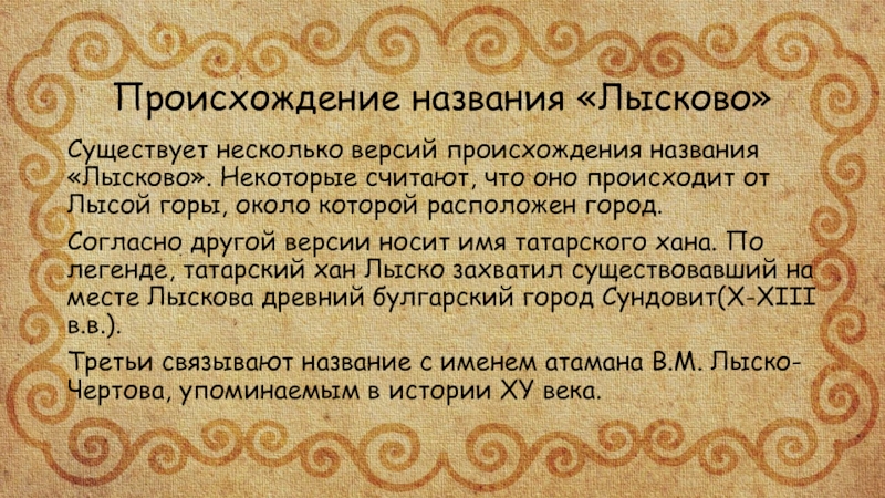 Согласно другой версии носит имя татарского хана. По легенде, татарский хан Лыско захватил существовавший на месте Лыскова древний булгарский город Сундовит(X-XIII в.в.).