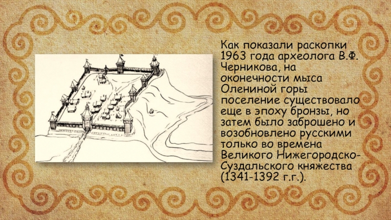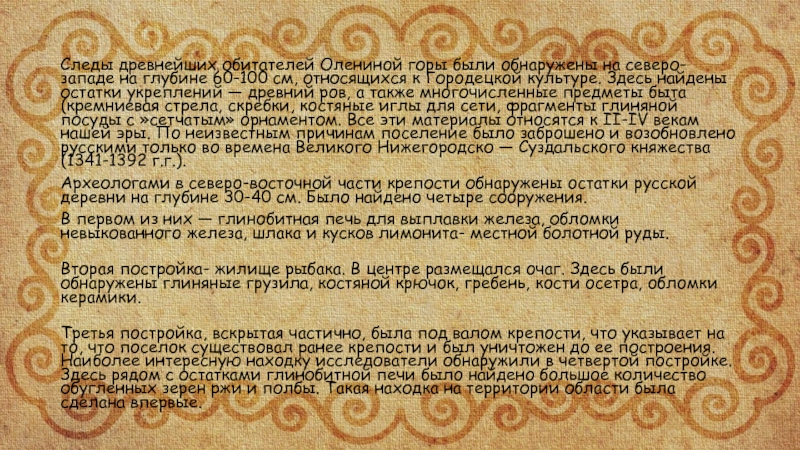 60-100 см, относящихся к Городецкой культуре. Здесь найдены остатки укреплений — древний ров, а также многочисленные предметы быта (кремниевая стрела, скребки, костяные иглы для сети, фрагменты глиняной посуды с »сетчатым» орнаментом. Все эти материалы относятся к II-IV векам нашей эры. По неизвестным причинам поселение было заброшено и возобновлено русскими только во времена Великого Нижегородско — Суздальского княжества (1341-1392 г.г.).