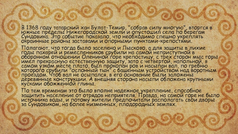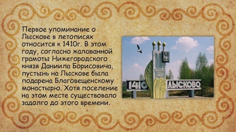 Слайд 12Первое упоминание о Лыскове в летописях относится к 1410г. В этом году,