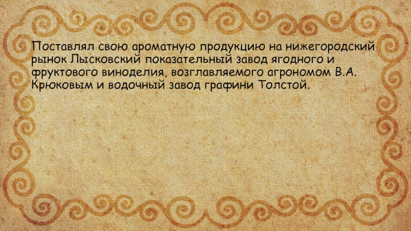 Слайд 35Поставлял свою ароматную продукцию на нижегородский рынок Лысковский показательный завод ягодного