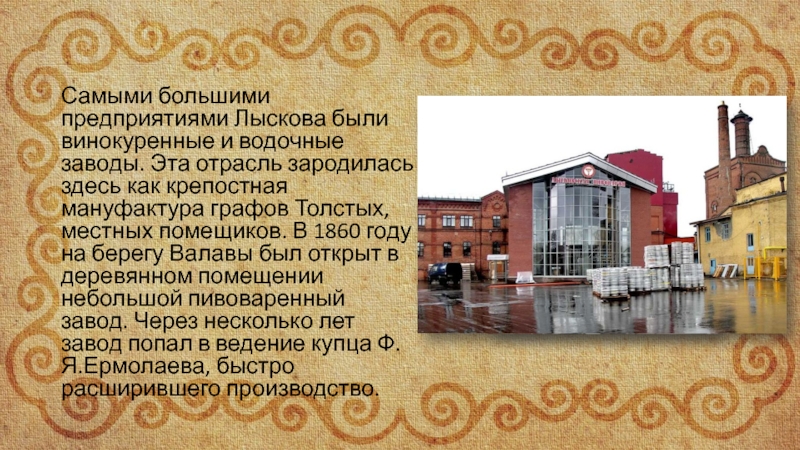 Слайд 33Самыми большими предприятиями Лыскова были винокуренные и водочные заводы. Эта отрасль