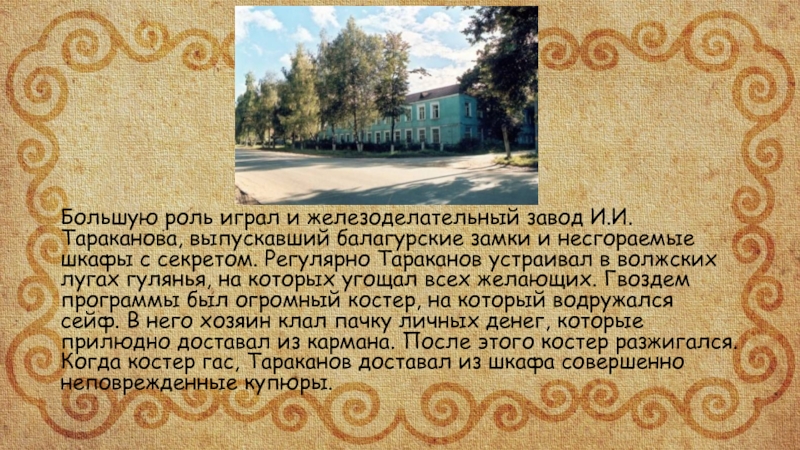 Слайд 34Большую роль играл и железоделательный завод И.И.Тараканова, выпускавший балагурские замки и