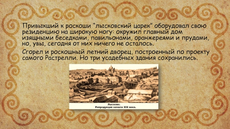 Слайд 28Привыкший к роскоши “лысковский царек” оборудовал свою резиденцию на широкую ногу:
