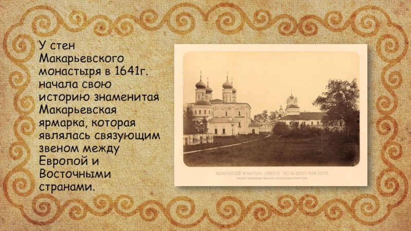 Слайд 6У стен Макарьевского монастыря в 1641г. начала свою историю знаменитая Макарьевская