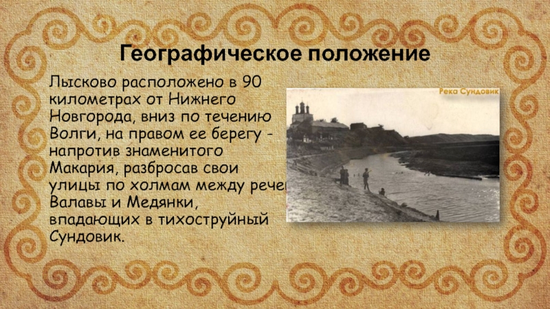 запада) и Лысой (с востока) горами. Северной границей Лыскова служит река Сундовик. Некогда здесь прямо у домов плескала свои воды Волга, но за прошедшие века русло великой русской реки отступило почти на два километра.