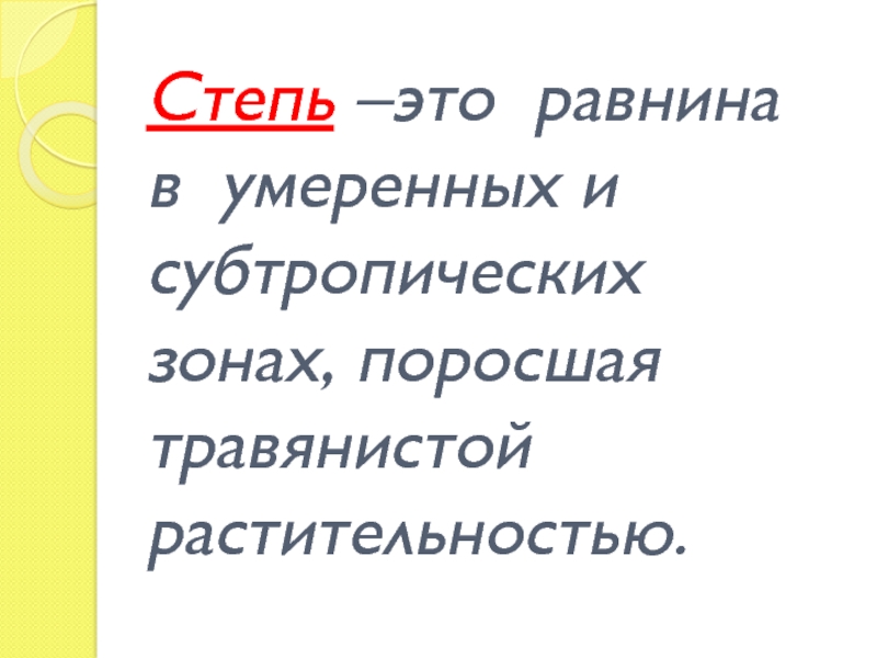Слайд 5Степь –это равнина в умеренных и субтропических зонах, поросшая травянистой растительностью.