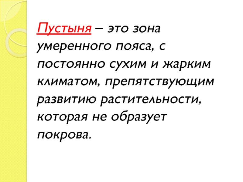 Пустыня – это зона умеренного пояса, с постоянно сухим и жарким климатом, препятствующим развитию растительности, которая не