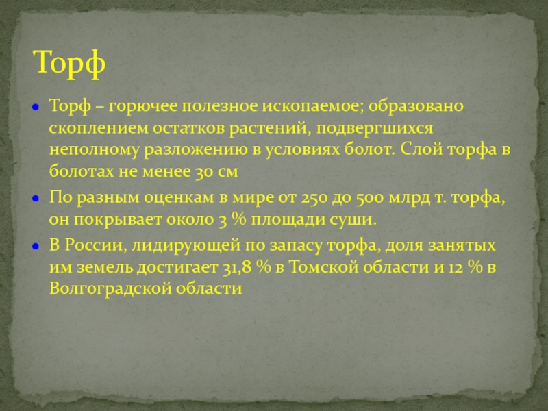 Торф – горючее полезное ископаемое; образовано скоплением остатков растений, подвергшихся неполному