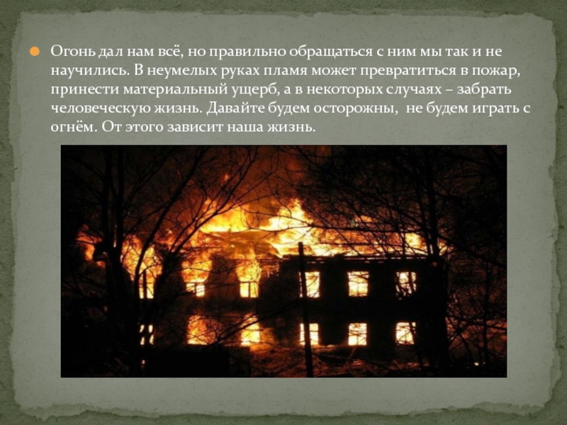 Слайд 21Огонь дал нам всё, но правильно обращаться с ним мы так