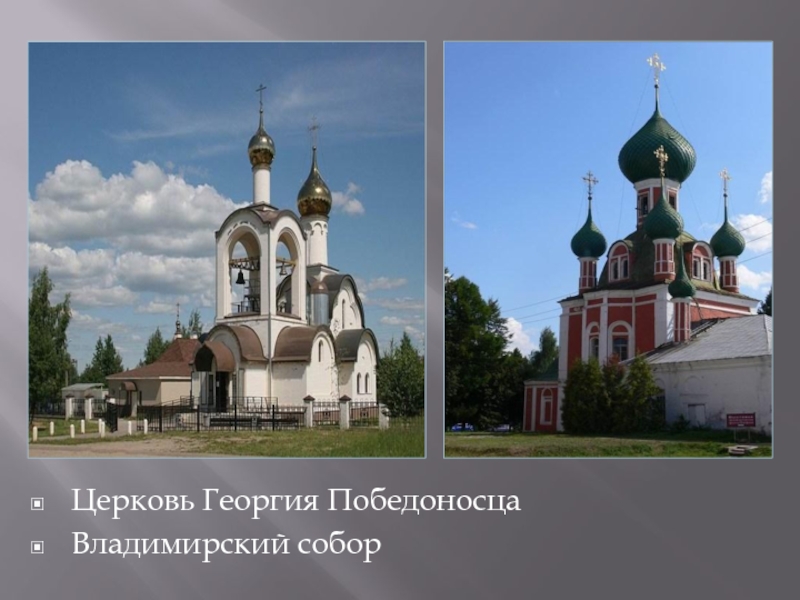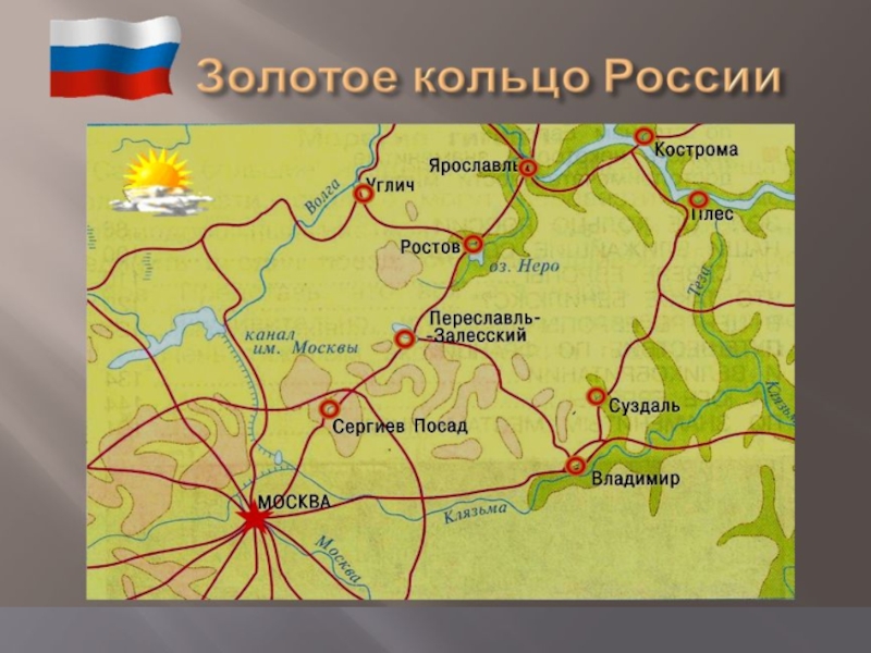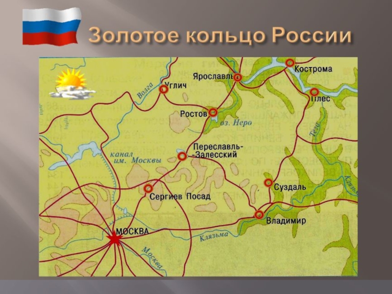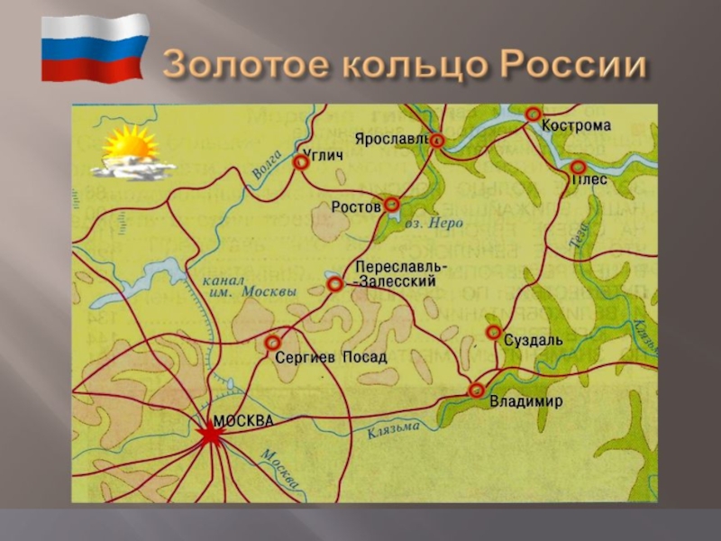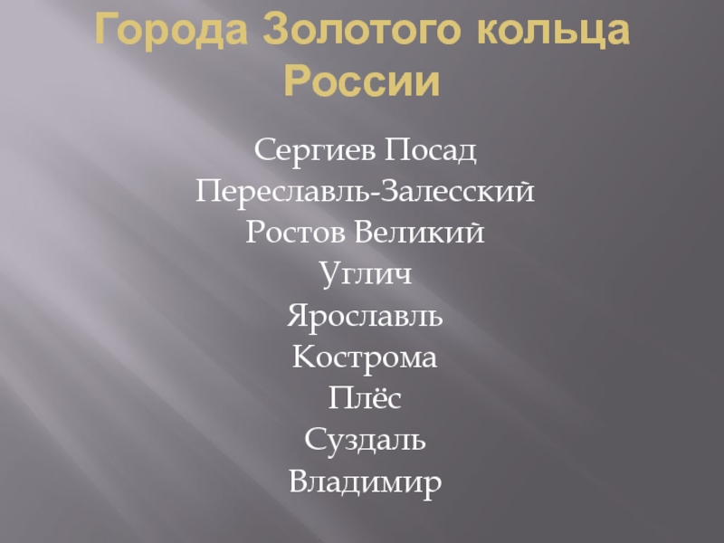 Города Золотого кольца РоссииСергиев ПосадПереславль-ЗалесскийРостов ВеликийУгличЯрославльКостромаПлёсСуздальВладимир
