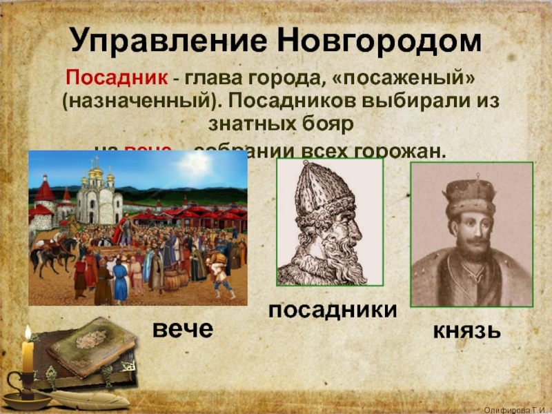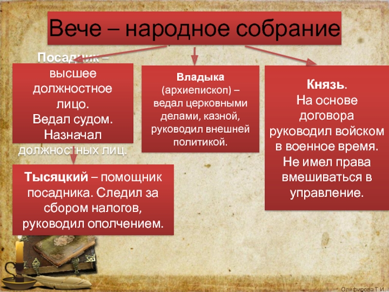 Тысяцкий – помощник посадника. Следил за сбором налогов, руководил ополчением.