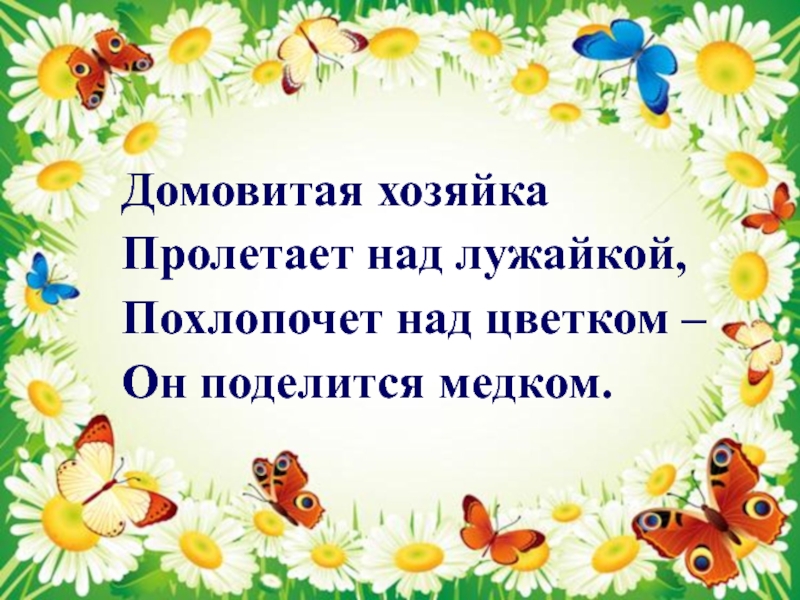 Домовитая хозяйкаПролетает над лужайкой,Похлопочет над цветком – Он поделится медком.