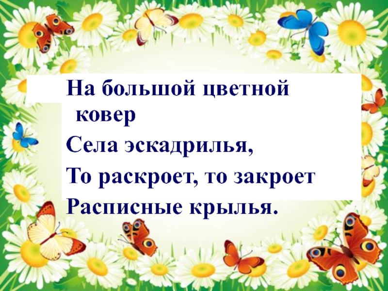 На большой цветной коверСела эскадрилья,То раскроет, то закроетРасписные крылья.