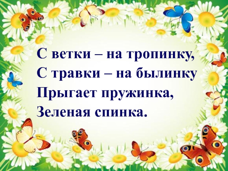 С ветки – на тропинку,С травки – на былинкуПрыгает пружинка, Зеленая спинка.