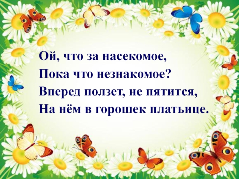 Ой, что за насекомое,Пока что незнакомое?Вперед ползет, не пятится,На нём в горошек платьице.