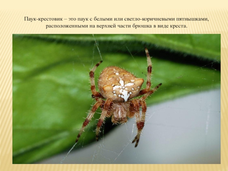 Слайд 2Паук-крестовик – это паук с белыми или светло-коричневыми пятнышками, расположенными на верхней