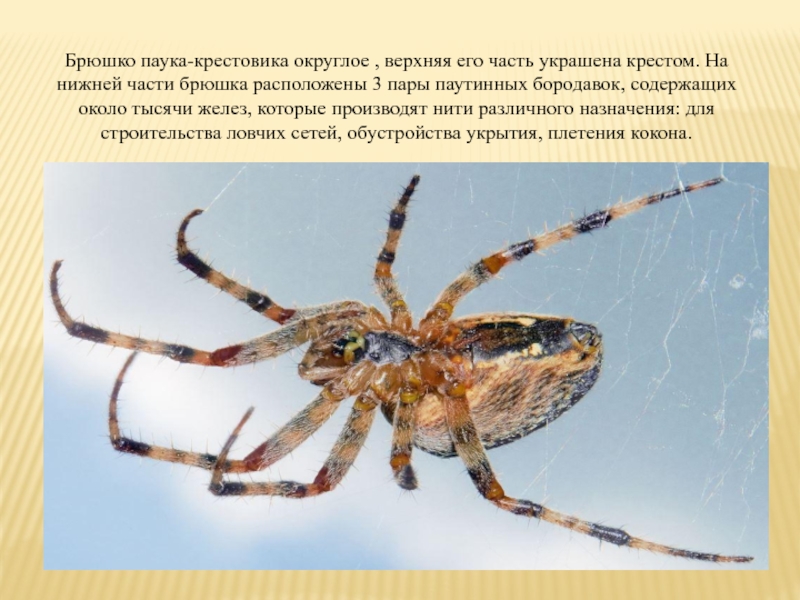 Брюшко паука-крестовика округлое , верхняя его часть украшена крестом. На нижней части брюшка расположены 3 пары паутинных