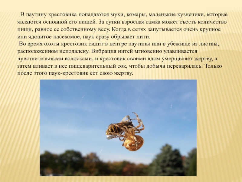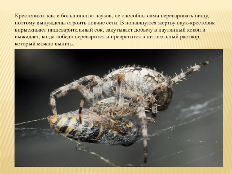 Слайд 6Крестовики, как и большинство пауков, не способны сами переваривать пищу, поэтому
