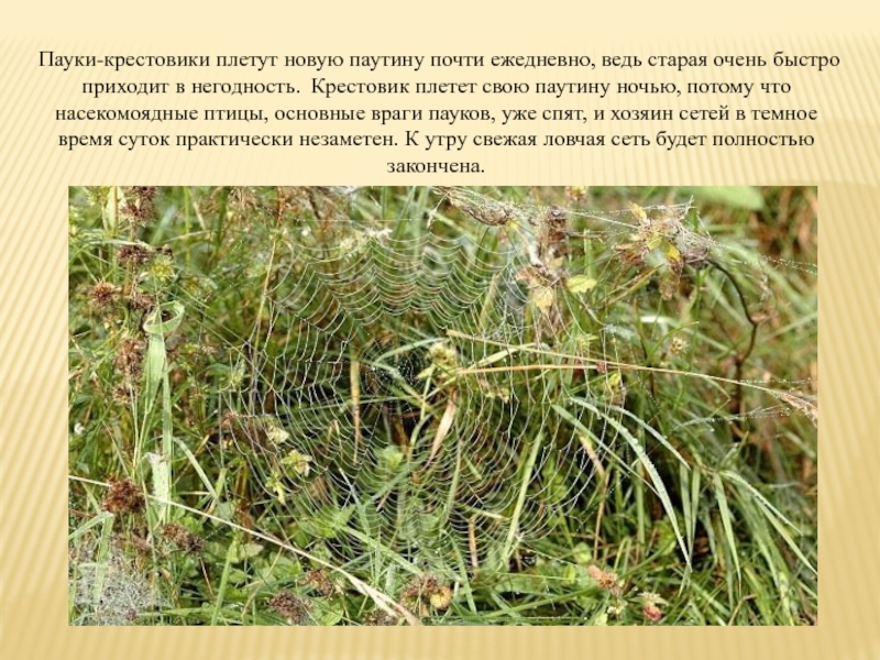 Слайд 7Пауки-крестовики плетут новую паутину почти ежедневно, ведь старая очень быстро приходит
