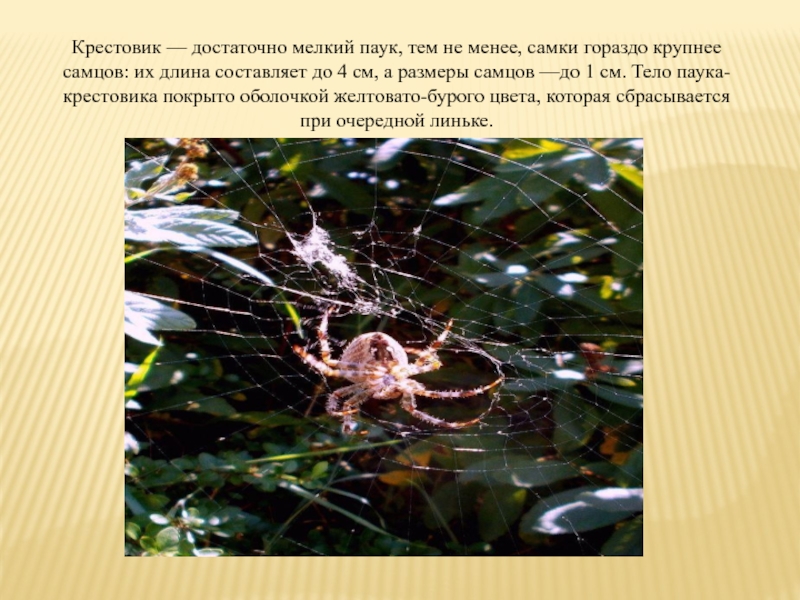 Слайд 3Крестовик — достаточно мелкий паук, тем не менее, самки гораздо крупнее