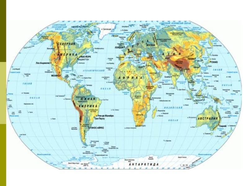 На физической карте синим цветом обозначена вода, коричневым, желтым, зелены - суша, белым – ледняки.