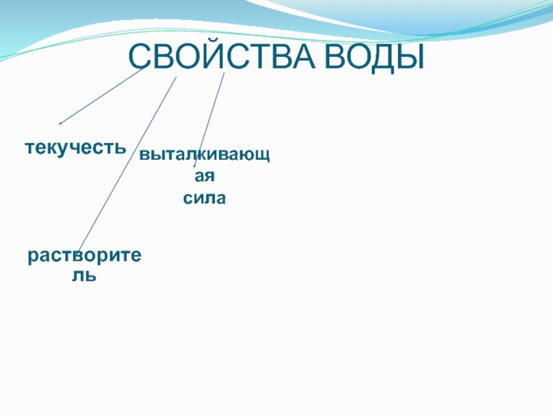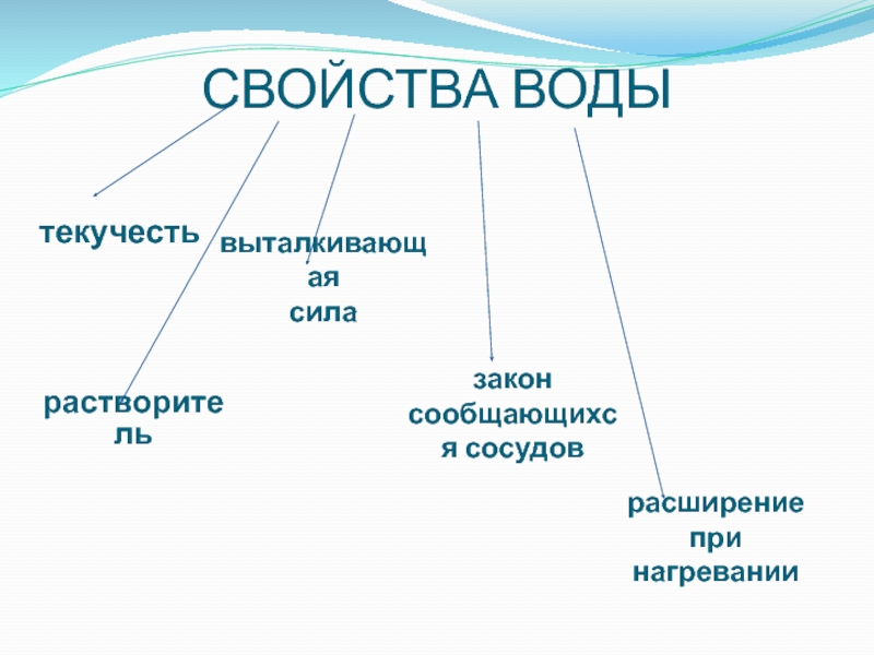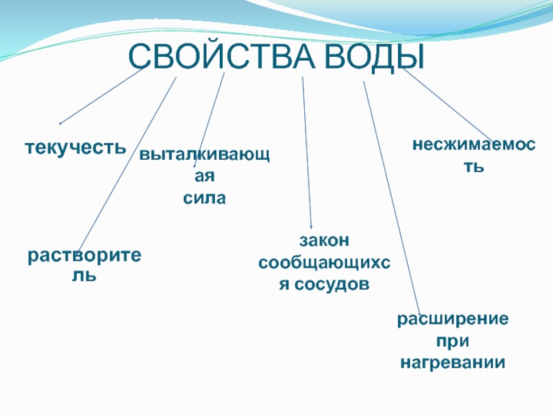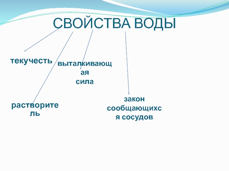 СВОЙСТВА ВОДЫтекучестьвыталкивающая силазакон сообщающихся сосудоврастворитель