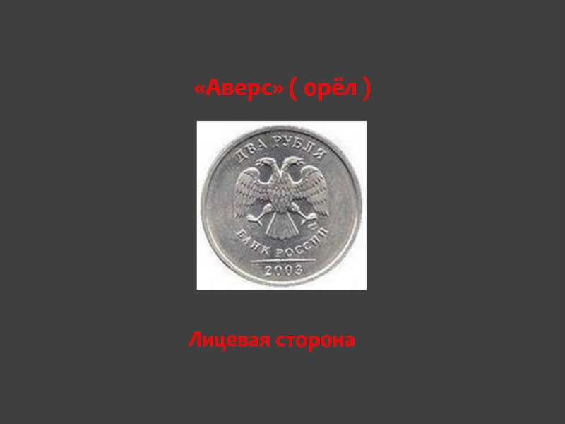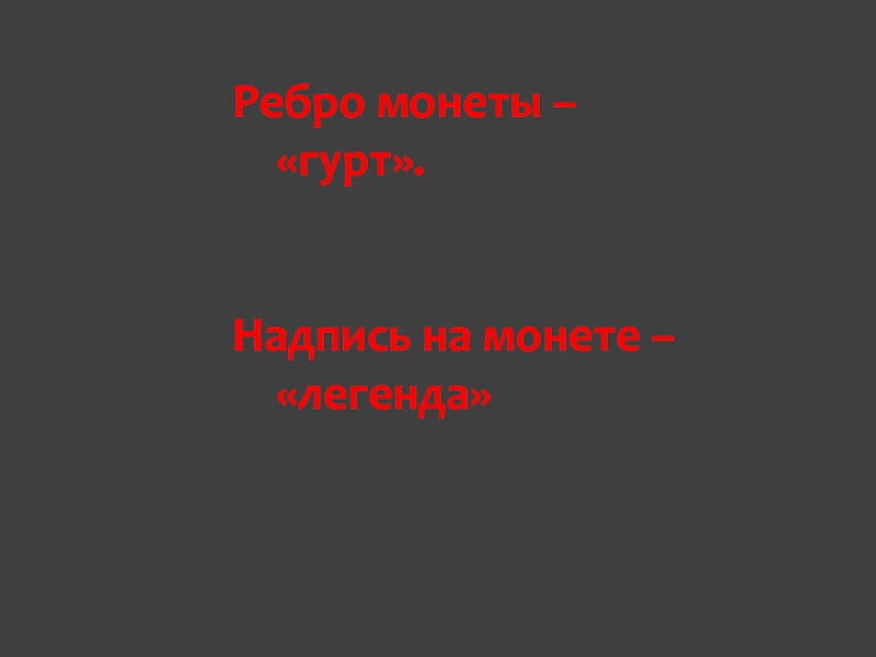 Ребро монеты –	«гурт».Надпись на монете – 	«легенда»