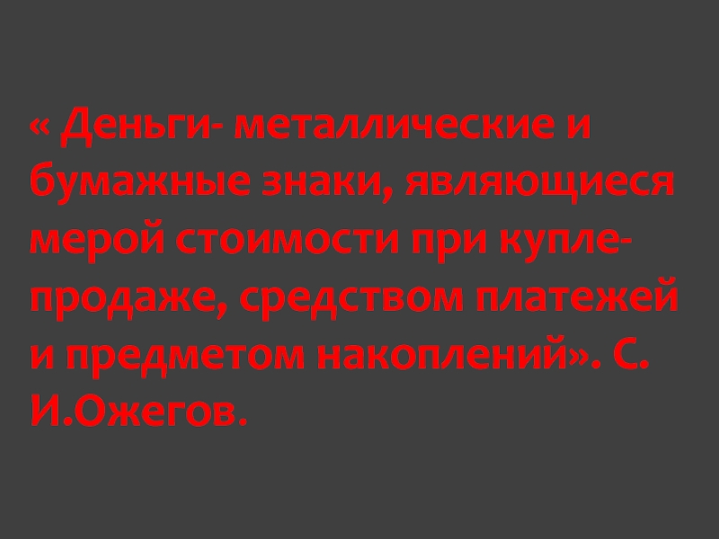Слайд 7« Деньги- металлические и бумажные знаки, являющиеся мерой стоимости при купле-