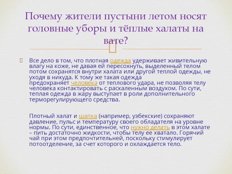 Почему жители пустыни летом носят головные уборы и тёплые халаты на вате?