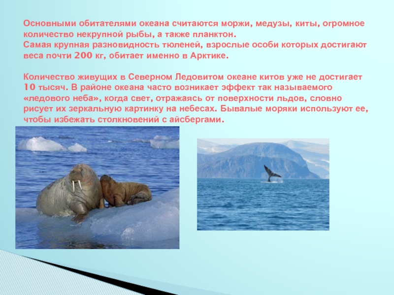 Слайд 8Основными обитателями океана считаются моржи, медузы, киты, огромное количество некрупной рыбы,