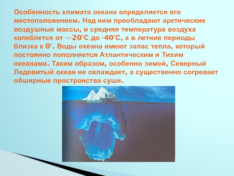 Слайд 7Особенность климата океана определяется его местоположением. Над ним преобладают арктические воздушные