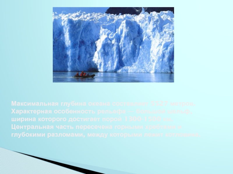 Слайд 6Максимальная глубина океана составляет 5527 метров. Характерная особенность рельефа — большой