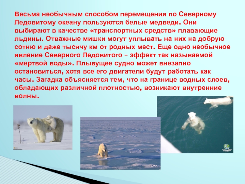Слайд 9Весьма необычным способом перемещения по Северному Ледовитому океану пользуются белые медведи.