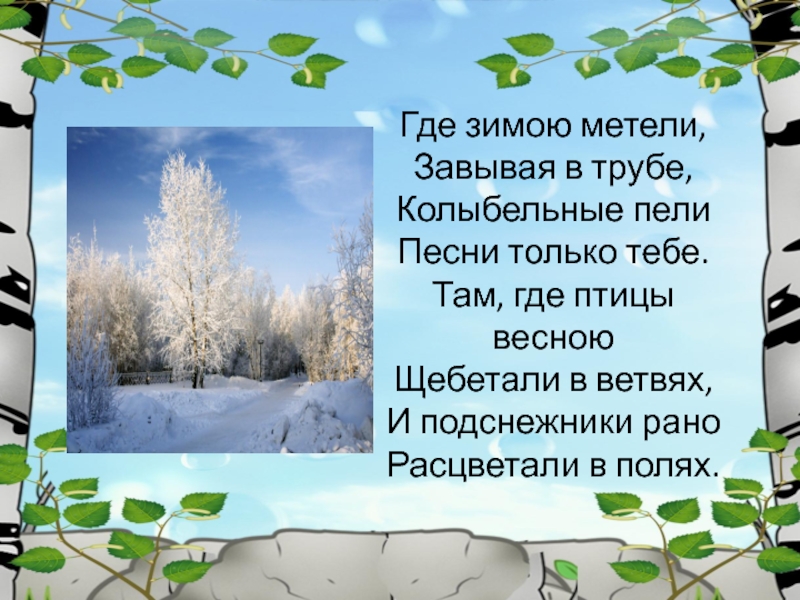 Слайд 3Где зимою метели, Завывая в трубе, Колыбельные пели Песни только тебе. Там, где птицы весною Щебетали