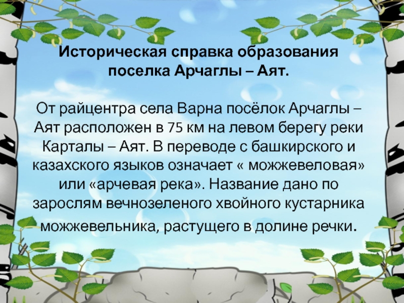 Слайд 6 Историческая справка образования поселка Арчаглы – Аят. От райцентра села Варна посёлок