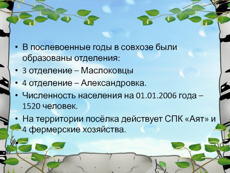 В послевоенные годы в совхозе были образованы отделения:3 отделение – Маслоковцы4 отделение – Александровка.Численность населения на 01.01.2006