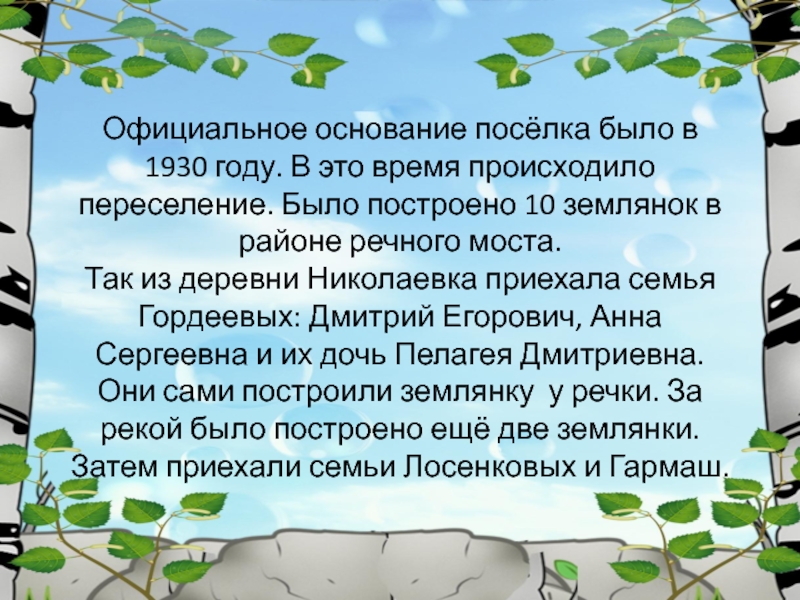 переселение. Было построено 10 землянок в районе речного моста. Так из деревни Николаевка приехала семья Гордеевых: Дмитрий Егорович, Анна Сергеевна и их дочь Пелагея Дмитриевна. Они сами построили землянку у речки. За рекой было построено ещё две землянки. Затем приехали семьи Лосенковых и Гармаш.