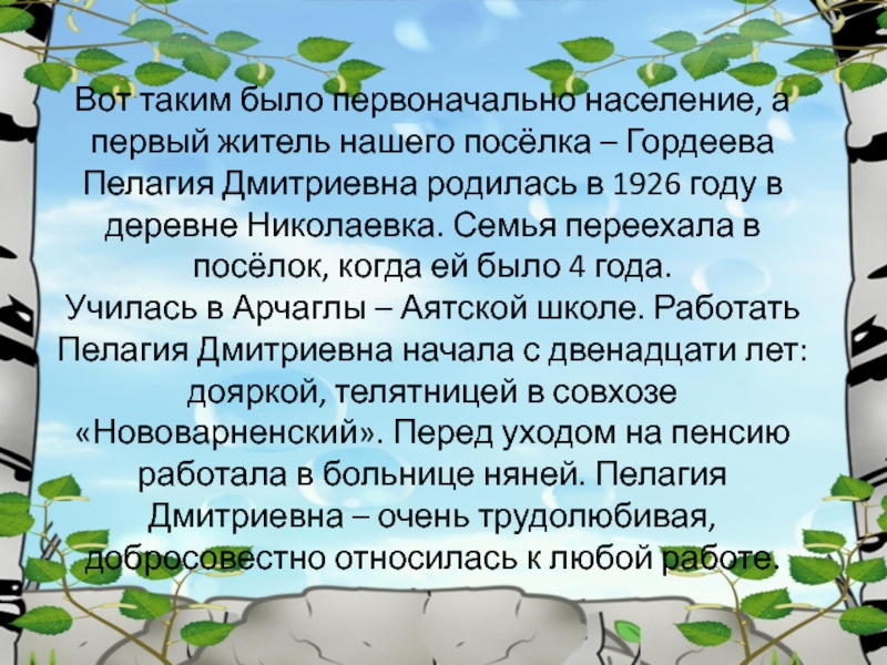 – Гордеева Пелагия Дмитриевна родилась в 1926 году в деревне Николаевка. Семья переехала в посёлок, когда ей было 4 года. Училась в Арчаглы – Аятской школе. Работать Пелагия Дмитриевна начала с двенадцати лет: дояркой, телятницей в совхозе «Нововарненский». Перед уходом на пенсию работала в больнице няней. Пелагия Дмитриевна – очень трудолюбивая, добросовестно относилась к любой работе.