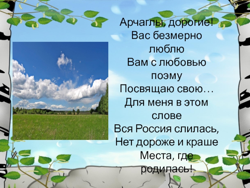 Слайд 2Арчаглы, дорогие! Вас безмерно люблю Вам с любовью поэму Посвящаю свою… Для меня в этом