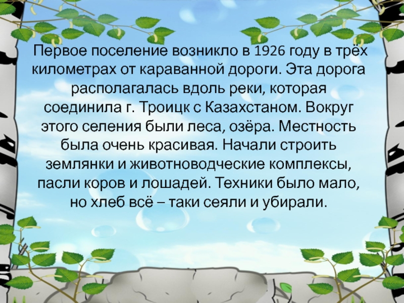 дороги. Эта дорога располагалась вдоль реки, которая соединила г. Троицк с Казахстаном. Вокруг этого селения были леса, озёра. Местность была очень красивая. Начали строить землянки и животноводческие комплексы, пасли коров и лошадей. Техники было мало, но хлеб всё – таки сеяли и убирали.