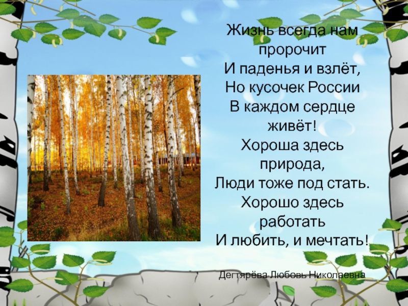 живёт! Хороша здесь природа, Люди тоже под стать. Хорошо здесь работать И любить, и мечтать!   Дегтярёва Любовь Николаевна