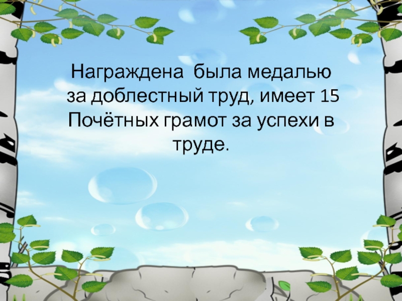 Награждена была медалью за доблестный труд, имеет 15 Почётных грамот за