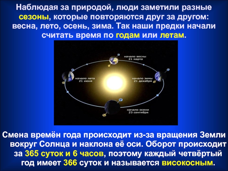 Смена времён года происходит из-за вращения Земли вокруг Солнца и наклона её оси. Оборот происходит за 365 суток и 6 часов, поэтому каждый четвёртый год имеет 366 суток и называется високосным.