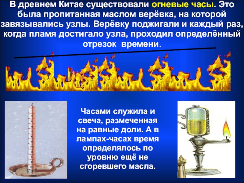 Часами служила и свеча, размеченная на равные доли. А в лампах-часах время определялось по уровню ещё не сгоревшего масла.