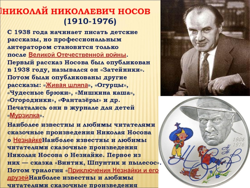 Наиболее известны и любимы читателями сказочные произведения Николая Носова о НезнайкеНаиболее известны и любимы читателями сказочные произведения Николая Носова о Незнайке. Первое из них — сказка «Винтик, Шпунтик и пылесос». Потом трилогия «Приключения Незнайки и его друзейНаиболее известны и любимы читателями сказочные произведения Николая Носова о Незнайке. Первое из них — сказка «Винтик, Шпунтик и пылесос». Потом трилогия «Приключения Незнайки и его друзей» (1953Наиболее известны и любимы читателями сказочные произведения Николая Носова о Незнайке. Первое из них — сказка «Винтик, Шпунтик и пылесос». Потом трилогия «Приключения Незнайки и его друзей» (1953—1954Наиболее известны и любимы читателями сказочные произведения Николая Носова о Незнайке. Первое из них — сказка «Винтик, Шпунтик и пылесос». Потом трилогия «Приключения Незнайки и его друзей» (1953—1954), «Незнайка в Солнечном городеНаиболее известны и любимы читателями сказочные произведения Николая Носова о Незнайке. Первое из них — сказка «Винтик, Шпунтик и пылесос». Потом трилогия «Приключения Незнайки и его друзей» (1953—1954), «Незнайка в Солнечном городе» (1958Наиболее известны и любимы читателями сказочные произведения Николая Носова о Незнайке. Первое из них — сказка «Винтик, Шпунтик и пылесос». Потом трилогия «Приключения Незнайки и его друзей» (1953—1954), «Незнайка в Солнечном городе» (1958) и «Незнайка на ЛунеНаиболее известны и любимы читателями сказочные произведения Николая Носова о Незнайке. Первое из них — сказка «Винтик, Шпунтик и пылесос». Потом трилогия «Приключения Незнайки и его друзей» (1953—1954), «Незнайка в Солнечном городе» (1958) и «Незнайка на Луне» (1964Наиболее известны и любимы читателями сказочные произведения Николая Носова о Незнайке. Первое из них — сказка «Винтик, Шпунтик и пылесос». Потом трилогия «Приключения Незнайки и его друзей» (1953—1954), «Незнайка в Солнечном городе» (1958) и «Незнайка на Луне» (1964—1965).