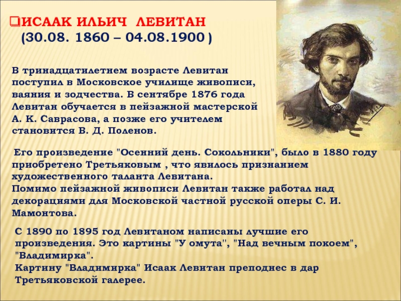 Его произведение "Осенний день. Сокольники", было в 1880 году приобретено Третьяковым , что явилось признанием художественного таланта Левитана.