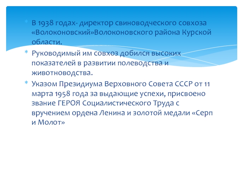 Слайд 4В 1938 годах- директор свиноводческого совхоза «Волоконовский»Волоконовского района Курской области.